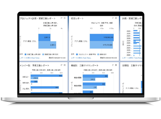 リアルタイム表示日々登録されるプロジェクトデータの計画と実績、売上と原価を期間単位、セグメント(部門、チーム、個人)単位でリアルタイム集計できます。