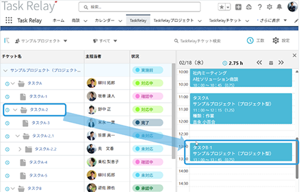 タスクに対する工数登録、リソース確認、関連する各種情報(取引先、商談、ファイル、承認など)などの情報を1画面からアクセス/更新ができます。